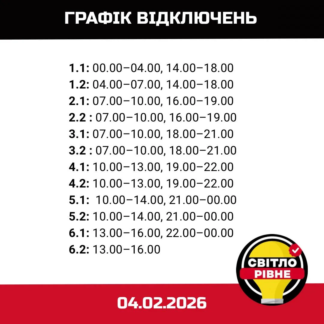 У середу 4 лютого згідно з розпорядженням НЕК “Укренерго” в Рівному та області діятимуть ГПВ.