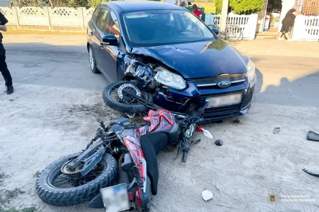 Внаслідок аварії постраждав і водій мотоцикла, і його 13-річний пасажир. Жоден із них не мав захисного шолома. У підлітка-водія медики діагностували відкритий перелом у ділянці ступні та численні забої. У пасажира – закрита черепно-мозкова травма, струс мозку та пошкодження грудної клітки. Обох госпіталізували.